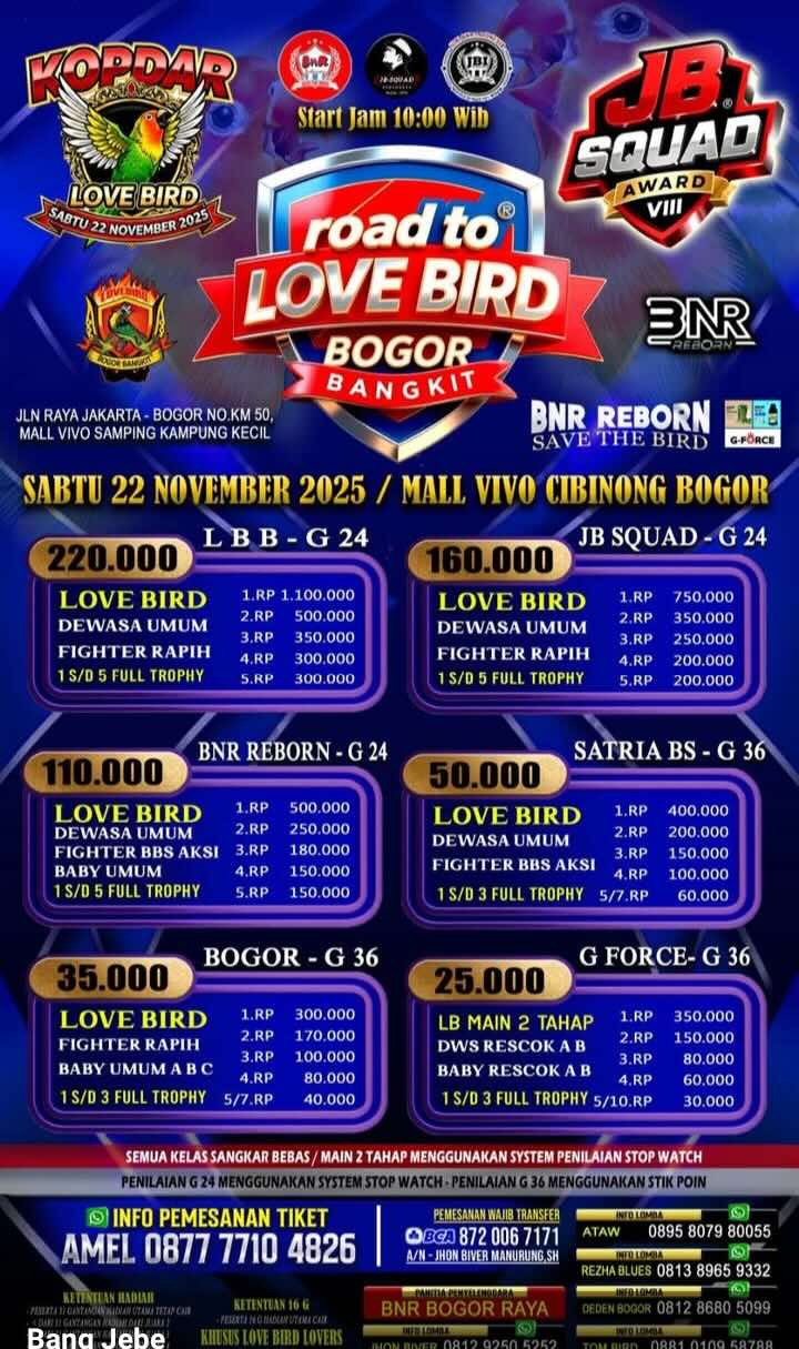 Gelaran ini yang bertajuk Road Kebangkitan Love Bird dimulai 22 November nanti di lapangan Mall Vivo, Cibinong.