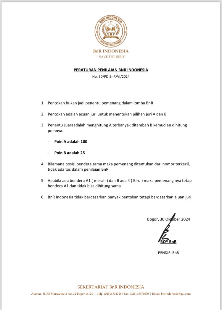 Tim juri BnR menjalankan penilaian dengan durasi standar 6–10 menit per sesi. Tiga parameter utama menjadi indikator performa burung yaitu, irama lagu, durasi kerja dan gaya burung. Seluruh proses dilakukan secara terbuka dan dapat diamati peserta, sehingga transparansi menjadi nilai positif yang terus dijaga BnR. Pada beberapa sesi, sorakan kecil dan tepuk tangan muncul saat burung-burung favorit menunjukkan aksi maksimalnya.