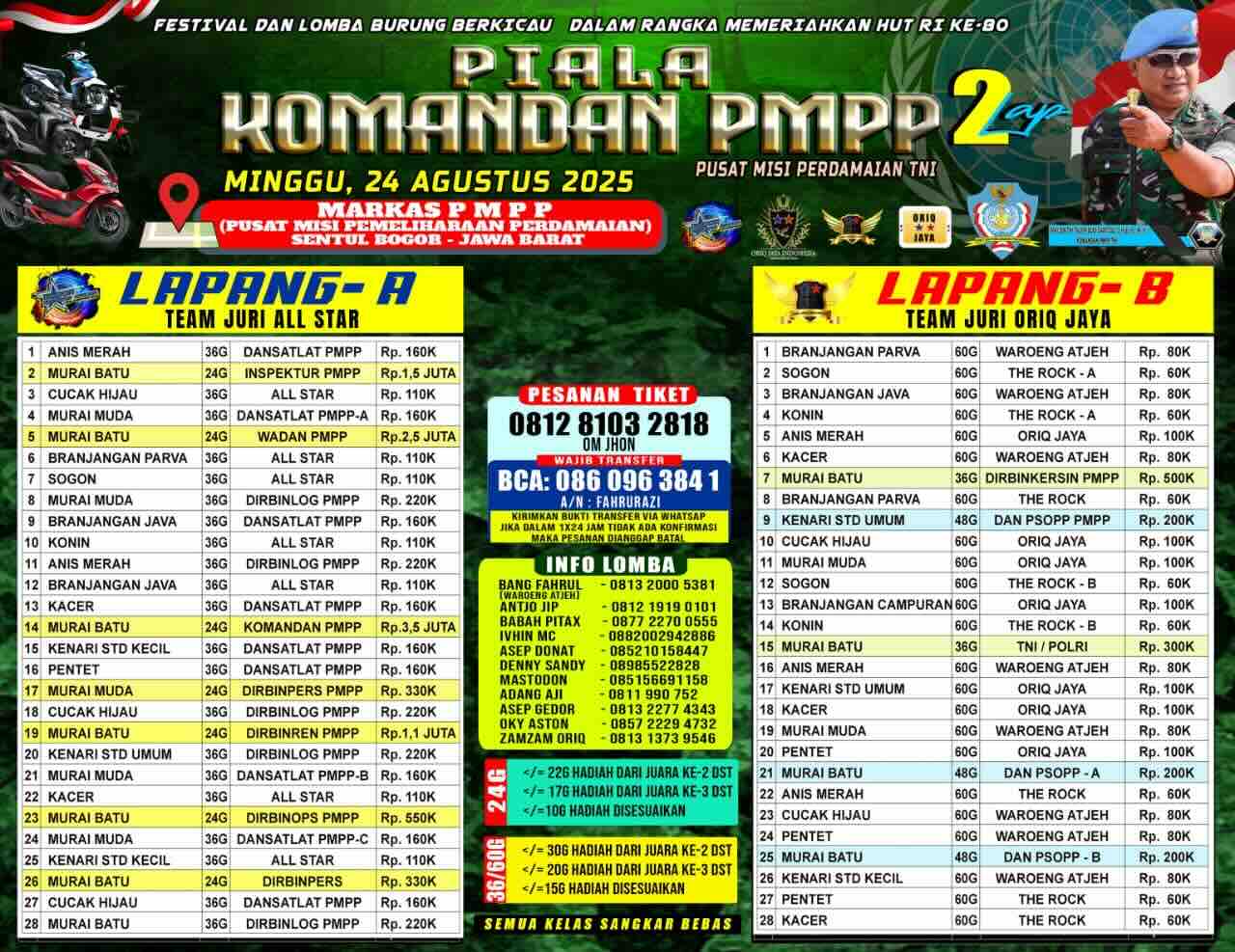 Untuk Kicaumania daftarkan sekarang juga burung jagoannya, pelajari jadwal lombanya karena event ini dipastikan akan dikawal langsung dengan juri-juri terbaiknya, bekerja secara jujur dan adil tanpa ada muatan apapun.